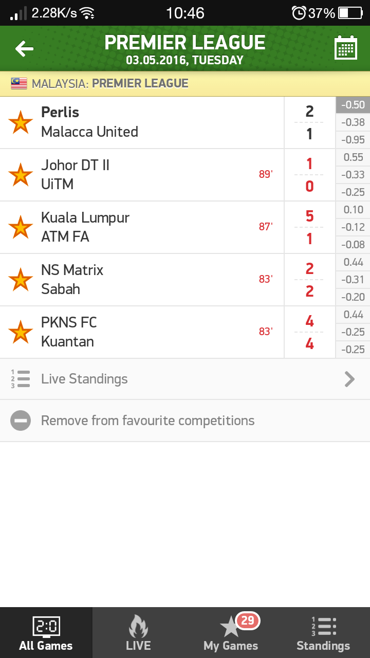 | 21:00 | Terengganu | 2-0 | Kuantan |